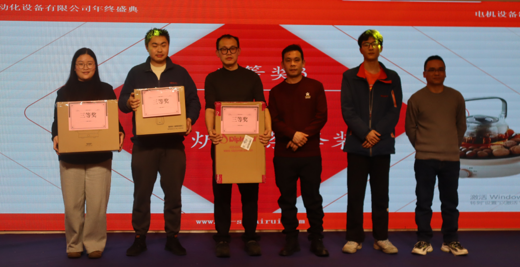 第一轮三等奖抽奖环节,电器主管、售后主管、工程主管依次上台,从抽奖箱里抽出3位幸运工号;